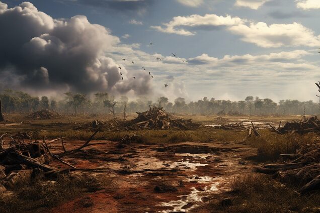Забруднення атмосфери пилом та сажею від пожеж може призвести до блокування сонячного світла на багато десятиліть, що спричинить різке глобальне похолодання, руйнування сільського господарства та масовий голод і вимирання усього живого, що на деякий час залишиться живим.