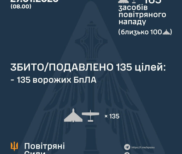 “Станом на 08:00 протиповітряною обороною збито/подавлено 135 ворожих БпЛА на півночі, півдні, в центрі та сході країни”, – ідеться в повідомленні.