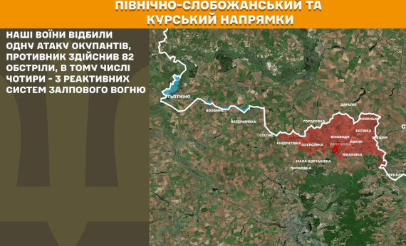 На Північно-Слобожанському і Курському напрямках минулої доби наші воїни відбили одну атаку окупантів, противник здійснив 82 обстріли, в тому числі чотири – з реактивних систем залпового вогню.