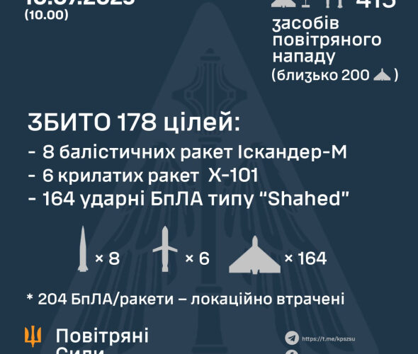 У ніч проти 10 липня противник атакував Україну 415-ма засобами повітряного нападу.
