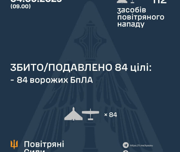 “За попередніми даними, станом на 09:00, протиповітряною обороною збито/подавлено 84 ворожих БпЛА типу Shahed і дронів-імітаторів різних типів на півночі, півдні та сході країни”, – ідеться в повідомленні.