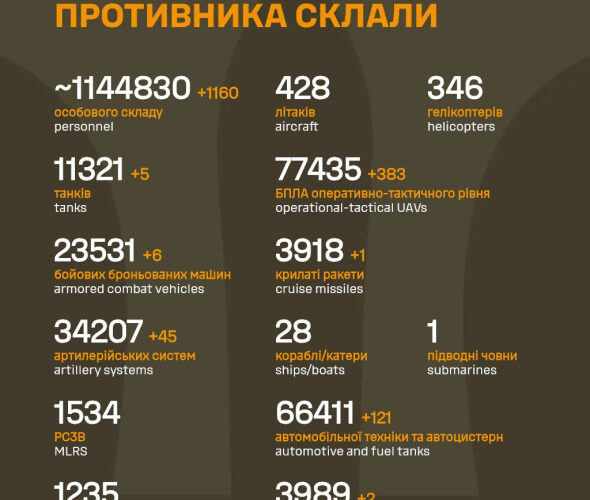 Станом на 3 листопада російська армія зазнала близько 1 144 830 втрат у живій силі від початку повномасштабного вторгнення в Україну.