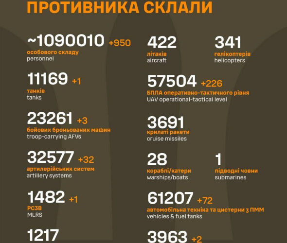 Загальні бойові втрати противника з 24.02.22 по 08.09.25 орієнтовно становлять:
