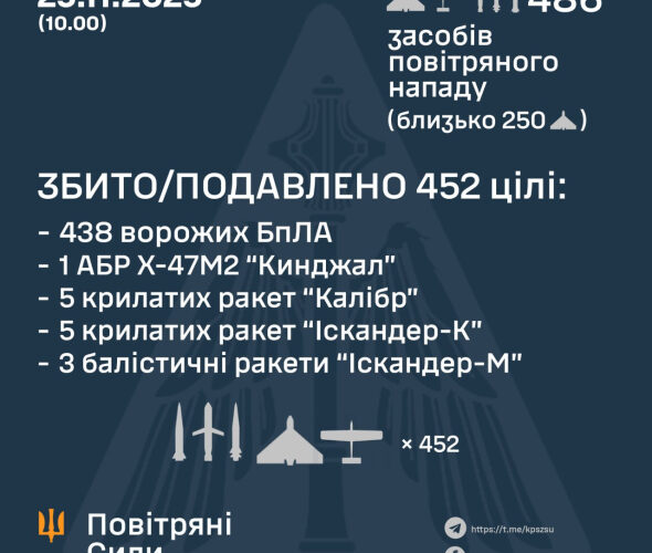 У ніч проти 25 листопада противник завдав комбінованого удару по об’єктах критичної інфраструктури України із застосуванням ударних БпЛА, ракет повітряного, морського та наземного базування.