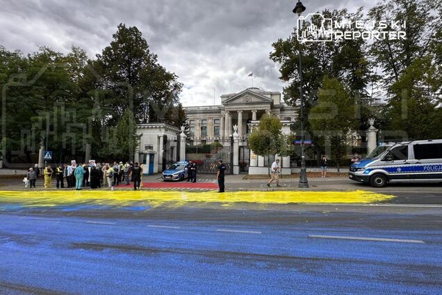 У суботу, 23 серпня, у польській столиці Варшаві асфальт перед посольством Росії розфарбували синьою та жовтою фарбою. Акція відбулася до Дня державного прапора України