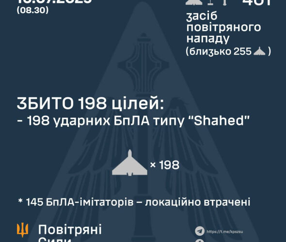 У ніч проти 16 липня противник атакував Україну балістичною ракетою “Іскандер-М”, а також 400-ми ударними БПЛА типу Shahed і безпілотниками-імітаторами різних типів (до 255 із них – “Шахеди”).