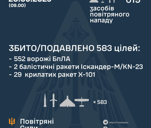 За попередніми даними, станом на 09.00, протиповітряною обороною збито/подавлено 583 повітряні цілі:
