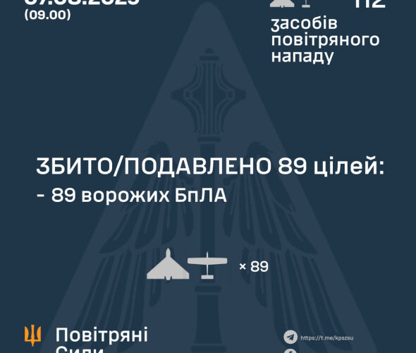 “За попередніми даними, станом на 09:00, протиповітряною обороною збито/подавлено 89 ворожих БПЛА типу Shahed і дронів-імітаторів різних типів на півночі, сході та в центрі країни”, – ідеться у повідомленні.
