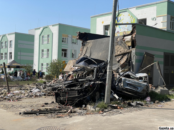 За кілька будинків від школи – ще один епіцентр удару. В фасад п’ятиповерхівки з боку Відрадного влучив дрон-камікадзе. Після нього, за словами місцевих, у двір упала ще й частина ракети, яка не здетонувала. Зруйновано частину нижніх поверхів, посипалась цегла, повністю знищена зовнішня стіна кількох квартир.