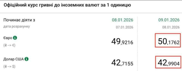 Офіційний курс на 9 січня встановили на рівні 42,99 грн за 1 долар, свідчать дані на сайті НБУ. Це є новим історичним рекордом, попередній максимум було встановлено лише день тому.