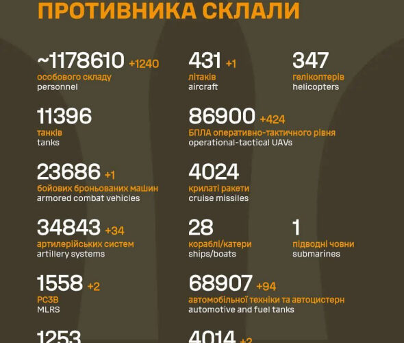 За добу ЗСУ ліквідували 1240 загарбників, повідомляє Генеральний штаб ЗСУ.